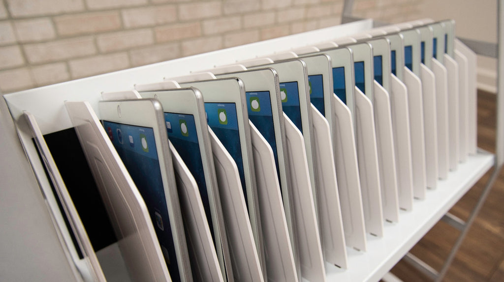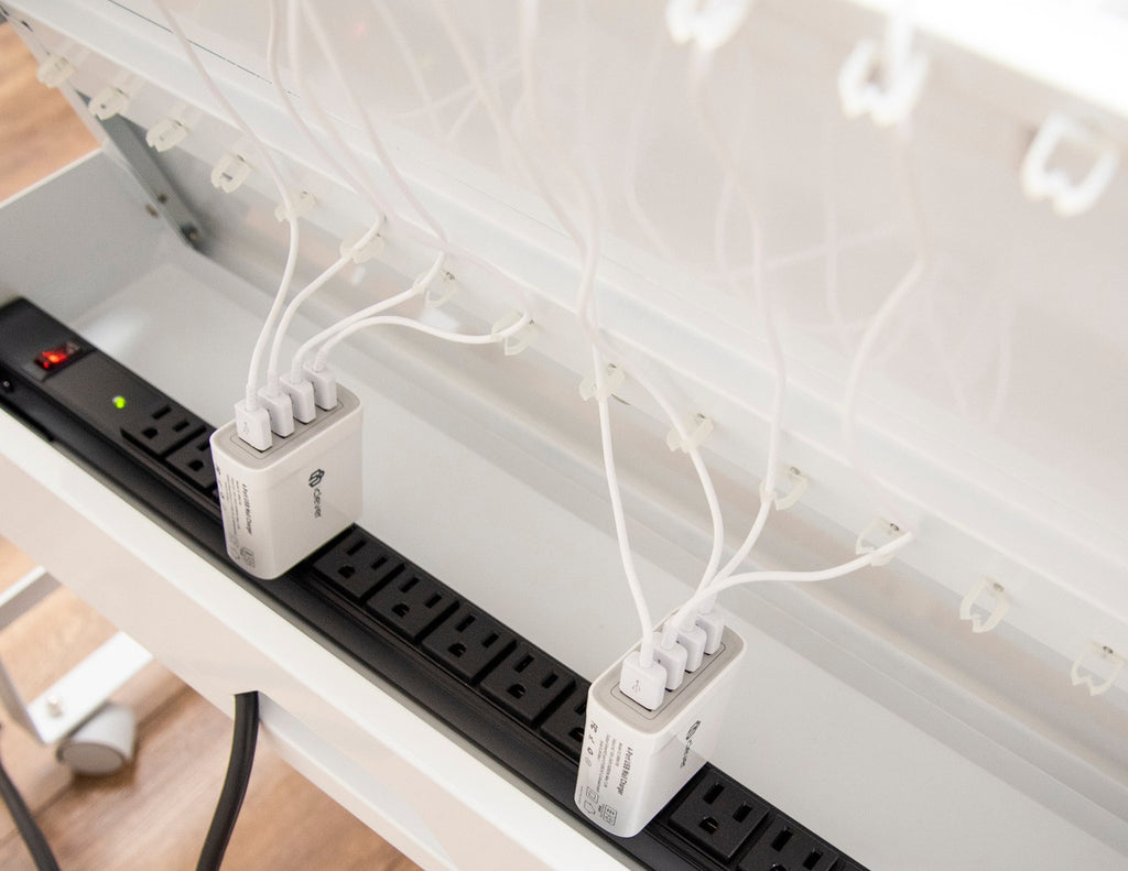 Special Note: Due to the latest, larger size of the 20W Apple iPad and Samsung Chromebook USB-C charging block adapters, only half of the available plug outlets are accessible in this unit. If you are using these power adapters, please contact Luxor customer service for the availability of special adapter cords that can be used to regain access to all charging plugs.